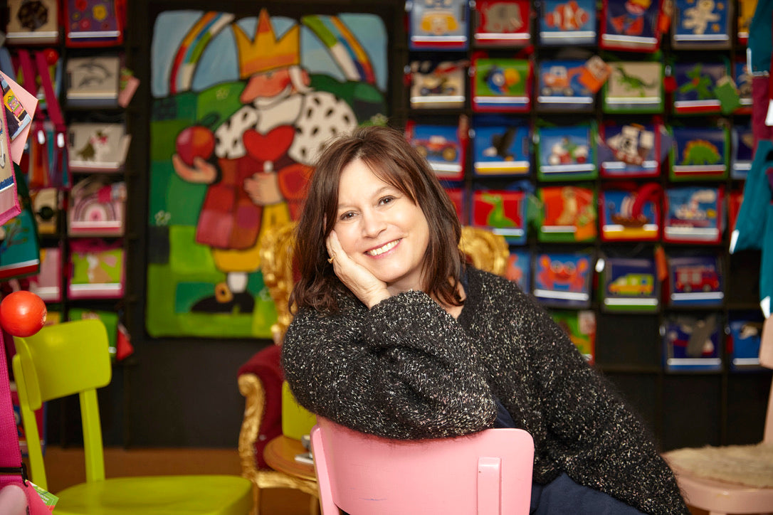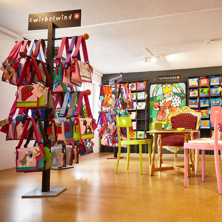 Täschli oder Rucksack aussuchen, Geschichte von Oskar hören, Foto auf dem Königsstuhl machen, Foto einnähen lassen und am Schluss Rundgang durch die Manufaktur.