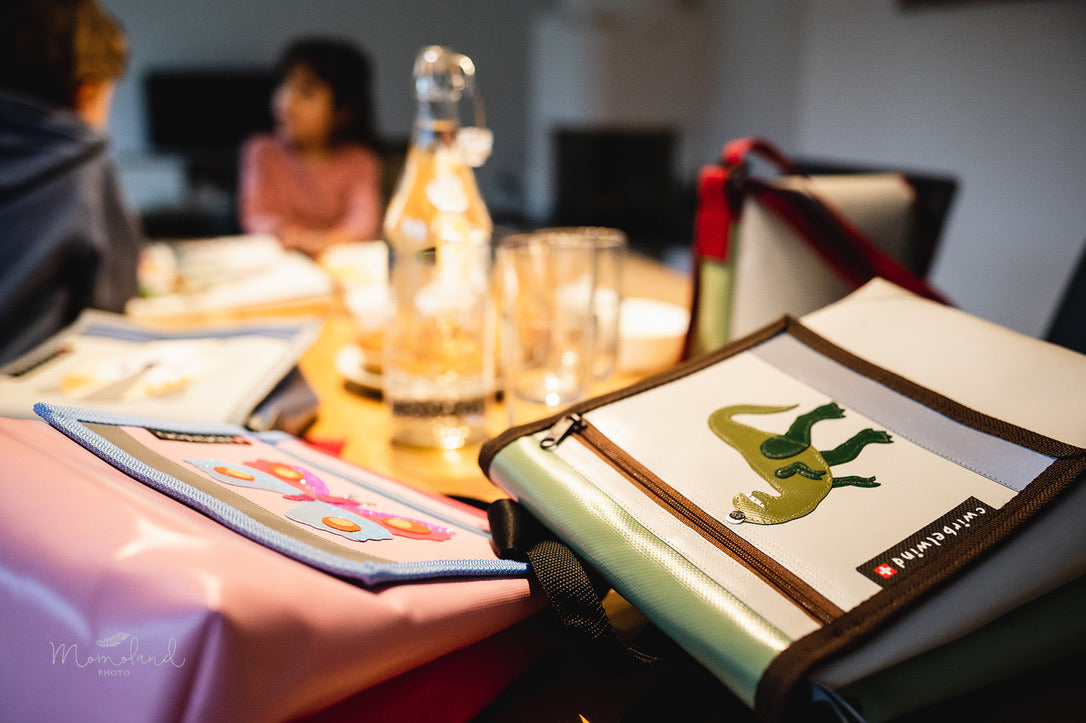 Unsere Produkte sind fröhlich, robust und praktisch für den Kinderalltag. Aus Blachenmaterial von Hand genäht, sind sie ein treuer Begleiter für den Alltag.